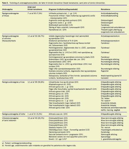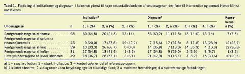 Resultater: Svarene fordelte sig på fem større grupper og en gruppe med svar fra diverse undersøgelser. 7,5% af 93 svar fra røntgen af columna lumbalis og thoracalis resulterede i klinisk konsekvens. Tallene fra røntgenundersøgelser af columna lumbalis og thorax (26,7% af 45), knæ (30,8% af 39) og hofter (3,2% af 31) samt ultralydundersøgelser af (øvre) abdomen (20,4% af 49) er ligeledes opgjort.