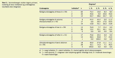 Undersøgelsernes resultater blev kategoriseret efter sværhedsgraden af den radiologiske diagnose. Lignende inddelinger er benyttet tidligere [10, 11]. Svaret intet abnormt (i.a.) blev kategoriseret som 1. Ukomplicerede fund uden klinisk relevans og uden sandsynlig sammenhæng med den aktuelle indikation som f.eks. pleuritidis sequelae, lumbosakral overgangshvirvel, solitær galdeblæresten og andre tilfældige fund blev kategoriseret som 2, mens moderate forandringer såsom arthrosis articulationis gen us 1. grad, let spondylose og let lungefibrose blev kategoriseret som 3, og svære forandringer som f.eks. sacculat aortaaneurisme in progressione, lungeinfiltrater og frakturer blev kategoriseret som 4. Kategoriseringen af de enkelte diagnoser blev foretaget af praksisreservelægen og den almen praktiserende læge i konsensus.