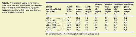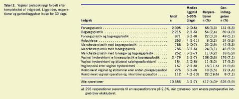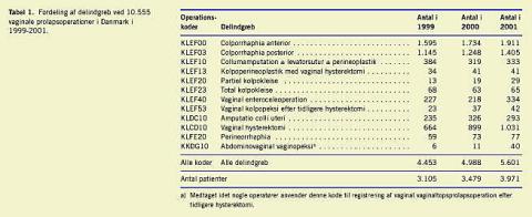 Resultater: Der blev foretaget 10.555 vaginale prolapsoperationer, fordelt på 48 sygehuse i 1999 og på 42 sygehuse i 2001 med en operationsaktivitet fra tre til 328 i 2001. Operationsaktiviteten steg med 26% fra 1999 til 2001. 96% af indgrebene var udelukkende vaginale. Liggetiden faldt fra mediant tre dage i 1999 til to dage i 2001, men med store lokale forskelle (medianer fra en til fire dage i 2001). Liggetiden steg signifikant med stigende alder og kompleksitet af indgrebet og faldt med stigende operationsaktivitet. Reoperationsraten inden for 30 dage var 4%, og den var signifikant lavere efter Manchesterplastik end efter vaginal hysterektomi. Der var 6% genindlæggelser og en mortalitet på 0,8. 3% fik foretaget ny prolapsoperation inden for den treårige periode.