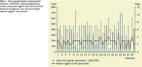 Summary Vaginal prolapse surgery in Denmark in 1999-2001: an analysis of operations performed, hospitalization and morbidity Ugeskr Læger 2004;166:3598-3601 Introduction: Our objective was to describe surgical activity, hospital stay and morbidity after vaginal prolapse surgery in Denmark in 1999-2001. Materials and methods: We analyzed data from the Danish National Patient Registry (DNPR). Results: There were 10,555 vaginal prolapse procedures performed during the period. There was a 26% productivity increase and a slight centralization from 48 hospitals in 1999 to 42 in 2001. Productivity ranged from 3 to 328 cases in 2001. 96% of the cases were purely vaginal. The length of hospital stay decreased from a median of three to a median of two days, but local differences were substantial (i.e., the medians ranged from one to four days in 2001). The length of hospital stay increased significantly with increasing age and surgical complexity and decreased with increasing surgical activity. Four percent of the patients were reoperated due to complications. The percentage of reoperation was significantly lower after the Manchester procedure than after vaginal hysterectomy. 6% were re-hospitalized within 30 days, and the mortality rate was 0.8. Three percent had another prolapse procedure performed within the three-year observation period. Discussion: There is substantial variability in surgical activity, length of hospital stay and choice of surgical procedure for utero-vaginal prolapse. Minimum demands for surgical activity and optimized perioperative programs will most certainly result in higher quality with considerable socio-economic benefit. Evidence for the efficacy of the various procedures is lacking. The development of a consensus about coding and options for the coding of complexity and recurrent procedures is desirable. Longitudinal registration in the DNPR combined with a national urogynaecologic database is recommended for quality control related to functional outcome and recurrence rate.