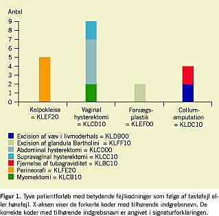 Kodningen af vaginal prolapskirurgi er væsentlig mere kompleks end f.eks. kodningen af hysterektomi, hvilket kan være en af forklaringerne på de misvisende kodninger, som vi tilskrev operatørfejl pga. manglende konsensus. De næsten ens operationskoder, hvor der blot er byttet om på to bogstaver eller to tal for vidt forskellige indgreb, antages at være den væsentligste årsag til sekretærfejl pga. taste- eller hørefejl. Dette betød, at fem unge kvinder, som havde fået foretaget perineorafi (KLFE20), var registreret, som om de havde fået fortaget kolpokleise (KLEF20). To fertilitetspatienter, som havde fået foretaget myomektomi (KLCB10), havde ifølge registreringen fået foretaget vaginal hysterektomi (KLCD10), mens to, der var opereret for ekstrauterin graviditet (KLBC10), var registreret som om, de havde fået foretaget collumamputation (KLDC10).