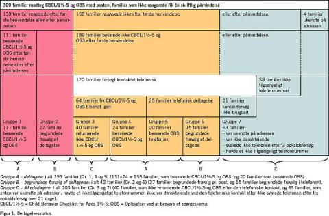 Af de 300 kontaktede forældre reagerede 138 (46%) efter de skriftlige henvendelser. Af de 138 besvarede 111 CBCL/1 -5 og OBS, mens 27 forældre begrundede deres fravalg. I alt 162 (54%) reagerede ikke på henvendelsen, fire var ukendte på adressen og blev ikke erstattet. Af de 158 forældre var det ikke muligt at finde telefonnumre på 38 familier. Der blev forsøgt telefonisk kontakt til 120 forældre. Herefter fik 40 forældre tilsendt undersøgelsesmaterialet igen men deltog ikke, 44 forældre besvarede CBCL/1 -5 og/eller OBS, 15 forældre begrundede fravalg telefonisk, og 21 forældre forstod ikke dansk eller blev forgæves forsøgt kontaktet tre gange.