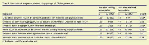 Resultater af sammenligning af svar på de seks udvalgte spørgsmål fra OBS er gengivet i Tabel 2 . Forældre, som del-tog efter den telefoniske henvendelse, mente hyppigere end forældre, som deltog efter de skriftlige henvendelser, at der er spørgsmål i CBCL/1-5, som virker etisk anstødelige, p < 0,05. Forældre, som deltog efter den telefoniske henvendelse, mente hyppigere end forældre, som deltog efter de skriftlige henvendelser, at deres viden om trivsel og adfærd hos børn er utilfredsstillende, p < 0,05.