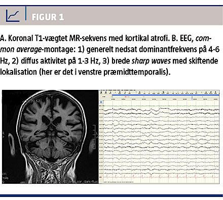 I november 2012 tilkom der kognitive symptomer i form af tiltagende hukommelsessvækkelse, som i december progredierede med bevidsthedspåvirkning og ekspressiv afasi, reduceret psykomotorisk tempo og bilateralt ekstensivt plantarrespons. MR-skanning af cerebrum og lumbalpunktur var uden nye abnorme fund, men på EEG var der tegn på encefalopati (Figur 1B). På mistanke om atypisk Parkinsons sygdom blev hun henvist til dopamintransporter-SPECT, undersøgelsen blev dog aldrig effektueret pga. yderligere progression. Hun blev udskrevet til aflastningsplads på et plejehjem uden at være endeligt diagnostisk afklaret.