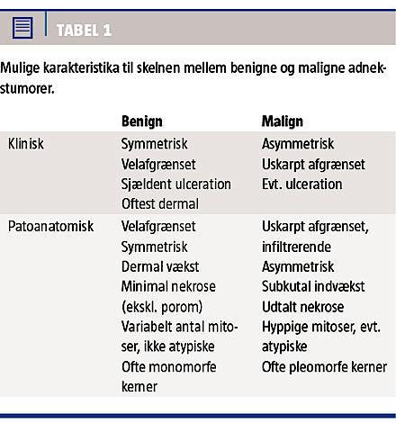 Adnekstumorer er oftest benigne, og malignitet er kun beskrevet i 4% af tilfældene [2]. Tumorerne udgøres hyppigt af mere end én differentieringslinje [3], hvilket kan vanskeliggøre klassifikationen. De morfologiske ligheder mellem benigne og maligne adnekstumorer (Tabel 1) kan som i tilfældet i sygehistorien betyde, at et lille fokus med invasiv vækst