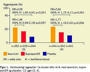 Vareniclin blev anvendt i 12 uger i to store (n = 1.025 og n = 1.027), veldesignede studier med rygere (> 9 cigaretter dagligt), der i gennemsnit røg 21-22 cigaretter/dag (Figur 1), [3, 4]. Vareniclin fandtes mere effektivt end placebo og bupropionSR med et års kontinuerlig ophørsrate på 22% (og 23%) for vareniclin, 16% (og 15%) for bupropionSR og 8% (og 10%) for placebo. Odds-ratio for vareniclin over for placebo var 2,7 og 3,1, hvilket er højere end for bupropionSR og nikotinprodukter. Vareniclin var signifikant mere effektivt end bupropionSR efter 12 uger med tendens til samme effekt efter 12 måneder (p = 0,004 og 0,057).