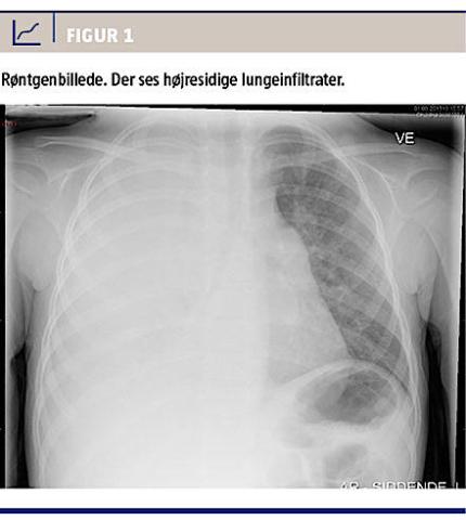 Dagen efter henvendte familien sig igen på afdelingen, da pigen hverken havde spist eller drukket. CRP-koncentrationen var steget til 116 mg/l og koncentrationen af de neutrofile granulocytter til 13,3 × 109/l. Ved en røntgenundersøgelse (Figur 1) sås højresidige lungeinfiltrater. Herpå blev der påbegyndt i.v. benzylpenicillin (1 mio. enh. × 3)-behandling. Pigens tilstand bedredes en anelse i løbet af de næste to dage, med temperaturfald til 38-38,5 °C. På den trejde indlæggelsesdag blev hun atter højfebril, CRP-koncentrationen var 102 mg/l, og koncentrationen af neutrofile granulocytter var 33,9 × 109/l. Efter konference med mikrobiologer ændredes behandlingen til i.v. cefuroxim (400 mg × 3) og gentamycin (60 mg × 1).