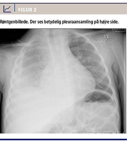 Den nye antibiotikastrategi ændrede ikke pigens tilstand de næste to dage. Hun forblev højfebril 39,5°C. Hun saturerede 94%, CRP-koncentrationen var 124 mg/l, og koncentrationen af de neutrofile granulocytter faldt til 19,6 × 109/l. Stetoskopisk hørtes ophævet luftskifte på højre lunge. Et røntgenbillede (Figur 2) viste betydelig pleuraansamling på højre side.