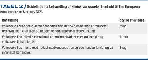 Ud fra den tilgængelige evidens har European Association of Urology udarbejdet retningslinjer for behandling af varicocele (Tabel 2).