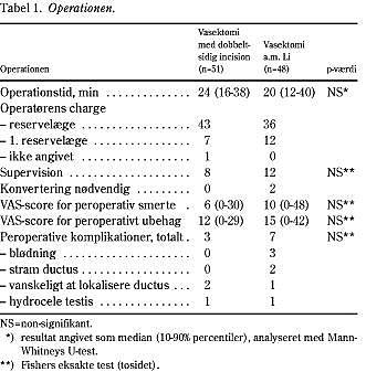 Den mediane operationstid var 24 minutter (16-38 minutter) ved vasektomi med dobbeltsidig incision vs. 20 minutter (12-40 minutter) ved vasektomi a.m. Li (p=0,27). Vasektomi med dobbeltsidig incision blev udført af en reservelæge i 43 tilfælde og af en 1. reservelæge i syv tilfælde. I et tilfælde var charge ikke angivet. Otte operationer krævede assistance fra anden læge, men ingen af indgrebene blev konverteret til alternativ operationsmetode. Vasektomi a.m. Li blev udført af en reservelæge i 36 tilfælde og i 12 tilfælde af en 1. reservelæge. Tolv indgreb krævede assistance fra anden læge (p = 0,32). To indgreb blev konverteret til vasektomi med dobbeltsidig incision i samme lokalanalgesi. En patient måtte ekskluderes forud for operationen pga. højt beliggende venstre testis og blev senere opereret i generel anæstesi uden for projekt (Tabel 1).