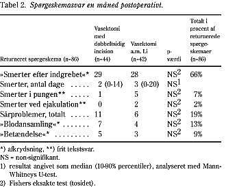 Spørgeskemaet blev returneret af 86 af 99 patienter (87%). Heraf angav 57 patienter (66%) smerter efter indgrebet i mediant tre dage (0-14 dage). Smerter i pungen eller smerter ved ejakulation fandtes hos henholdsvis 7% og 2%. Sårkomplikationer blev angivet af 17 patienter (19%). Samlet fandtes hæmatom hos 13% og infektion hos 9%. Der var ingen signifikante forskelle mellem de to metoder (Tabel 2).