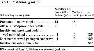 Mikroskopisvar på reseceret væv viste sufficient bilateral vasektomi hos 98 af 99 patienter (99%). Hos en patient vasektomeret med dobbeltsidig incision var der peroperativt problemer med at påvise hø. ductus deferens, og efterfølgende mikroskopisvar viste manglende materiale i prøve fra hø. ductus deferens. Kun 26 af 99 patienter (26%) afleverede sædprøve efter tre måneder, 13 vasektomeret med dobbeltsidig incision og 13 vasektomeret a.m. Li. To patienter havde positiv sædprøve ved første prøve, men gentaget sædprøve viste azoospermi. Fire patienter havde positiv sædprøve selv efter gentaget sædprøve (15%), en vasektomeret med dobbeltsidig incision og tre vasektomeret a.m. Li (p=0,35). Samlet blev vasektomien konstateret insufficient hos fem af 99 patienter (5%), to vasektomeret med dobbeltsidig incision og tre vasektomeret a.m. Li (p=0,67) (Tabel 3).