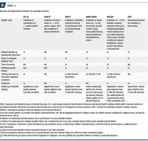 De hyppigst anvendte kriterier for VaD er henholdsvis National Institute of Neurological Disorders and Stroke-Association Internationale pour la Recherché et l’Enseignement en Neurosciences (NINDS-AIREN) [3], DSM-5 [4] og ICD-10 [5], samt specifikke kriterier for subkortikal iskæmisk VaD (SIVD) [6, 7] (Tabel 1). Kriterierne afviger indbyrdes, og sammenligninger viser lav overensstemmelse [8]. Der er ikke international konsensus om, hvilke kriterier der bør anvendes.