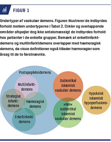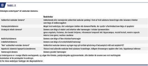 Der kan ikke opstilles en samlet sygdomsmodel for VaD, der dækker alle kliniske og neuropatologiske variationer. Der findes flere undertyper af VaD, f.eks. SIVD eller postapopleksidemens (Figur 1 og Tabel 2). For langt de fleste undertyper findes der dog ikke validerede kriterier, der klart definerer og afgrænser dem. Som eksempel kan demens hos en patient med et talamisk infarkt klassificeres både som strategisk infarkt-demens, postinfarktdemens og subkortikal VaD. Ofte skelnes der mellem storkarssygdom og småkarssygdom som årsag til VaD, selvom begge tilstande kan være til stede samtidig.