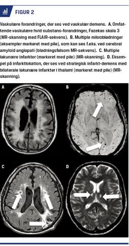 Som ved mistanke om anden demenssygdom bør der optages en grundig sygehistorie fra patient og pårørende samt udføres kognitiv testning og vurdering af ADL-funktion og neuropsykiatriske symptomer med validerede redskaber. Mindst én strukturel skanning bør udføres. CT er ofte tilstrækkelig, men MR-skanning har højere sensitivitet for vaskulære forandringer, og mikroblødninger er kun synlige med blodfølsomme MR-sekvenser. Fazekas skala er en ofte benyttet visuel skala til graduering af vaskulære hvid substans-forandringer (Figur 2). CSV-markører kan anvendes differentialdiagnostisk i forhold til andre neurodegenerative sygdomme (f.eks. AD), men der er p.t. ikke udviklet markører for VaD. Det skal nævnes, at f.eks. tau målt i CSV kan være abnormt forhøjet i uger efter et cerebralt infarkt. Vaskulære risikofaktorer bør afdækkes med bl.a. blodprøver, elektrokardiogram og anamneseoptag.