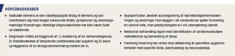 Cerebrovaskulær sygdom er en hyppig årsag til kognitiv svækkelse. De kliniske, radiologiske og neuropatologiske manifestationer er varierende, og VaD er som sygdomsbegreb ikke velafgrænset. Nyere begreber som VCD synes at være mere dækkende, men yderligere valideringsstudier er nødvendige. Der mangler fortsat diagnostiske kriterier, der afspejler specifikke kliniske og neuropatologiske undertyper med en specifik underliggende patofysiologi. Forskning i den retning vil facilitere udvikling af specifik behandling af vaskulær demens-sygdomme. Fokus på udredning og behandling af cerebrovaskulære risikofaktorer vil dog formodentligt også i fremtiden være vigtige komponenter i behandlingen af VaD.