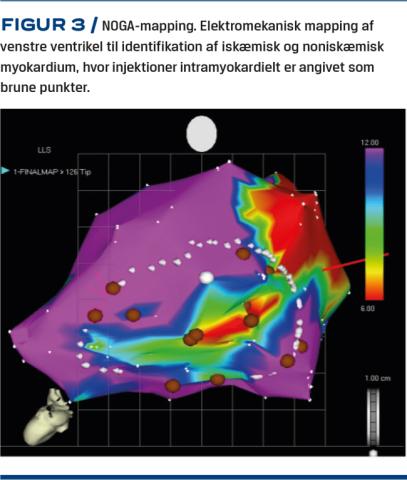 I det første danske studie, som blev publiceret i 2005, Euroinject One-studiet, blev 80 patienter med kronisk IHD inkluderet og randomiseret til enten plasmid-VEGF-A-165 eller placebo. De intramyokardielle injektioner blev foretaget kateterbaseret guidet af NOGA-mapping i områder med perfusionsdefekt visualiseret på stress-SPECT (Figur 3). Efter tre måneder observerede man en forbedring i venstre ventrikels vægbevægelse ved NOGA og ventrikulografi, men man fandt ingen forskel i stressinduceret perfusionsdefekt på SPECT mellem de to grupper [21].