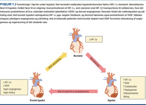 Atherosclerosis of coronary arteries can result in a hypoxic state where myocardial cells may become dysfunctional or die. The oxygen sensing transcription factor hypoxia inducible factor 1 responds to low oxygen levels by elevating the production of angiogenic growth factors, such as vascular endothelial growth factor (VEGF). Despite this, endogenous processes and conventional therapies are inefficient in some patients. To stimulate angiogenesis, VEGF has been injected into the myocardium. As stated in this review, this therapy has so far been proven safe and studies are conducted in several countries, including Denmark.
