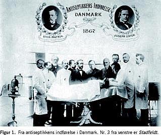 Omkring årsskiftet 1847-1848 blev Levi af sin ven og kollega professor G.A. Michaelis (1798-1848) fra Kiel informeret om, at Semmelweis havde opnået glimrende resultater ved at indføre håndvask i klorkalk inden deltagelse i fødslerne. Levy nægtede at tro på Semmelweis ' resultater og argumenterede kraftigt imod dem, hvilket man må undre sig over, da det ville have været meget nemt at efterprøve dem. Levys assistenter Asger Stadfeldt (1830-1896) og Franz Howitz (1828-1912) havde nogenlunde samme indstilling som Levy på dette tidspunkt, selv om Howitz var den, der hældede mest til kontagiositetshypotesen. Gennembruddet for denne hypotese kom, da kirurgen Joseph Lister (1827-1912) i 1865 begyndte at anvende karbol til sårbehandlingen af komplicerede frakturer og derved fik en dramatisk nedsættelse af mortaliteten blandt sine patienter. Ideen med at benytte karbol havde han fået fra byen Carlisle, hvor man brugte karbol til at fjerne voldsomme lugtgener fra byens kloakvand. Allerede i 1864 skiftede Howitz standpunkt og begyndte at argumentere for Semmelweis ' kontagiositetslære. Han skrev i 1864 i Hospitalstidende en artikel om fødselstiftelser, hvori han intensivt støttede kontagiositetslæren. Stadfeldt , der var en sindig natur, der ikke havde let ved at tilegne sig nye anskuelser, indså først det rigtige i kontagiositetshypotesen, efter at Listers arbejde om antiseptikken var fremkommet i 1867. Ikke desto mindre blev det Stadfeldt , der som nytiltrådt professor ved Fødselsstiftelsen indførte den listeriske karbolantiseptik og senere fik æren for at være den første (eller en af de første), der indførte antiseptikken på en fødeafdeling (Figur 1 ). Efter Levys død havde Stadfeldt sejret i professorkonkurrencen over Howitz trods den almindelige erkendelse af, at Howitz var Stadfeldt overlegen i både naturlig begavelse, originalitet og kritisk sans. Men det blev altså Stadfeldt , der - måske ikke helt retfærdigt - fik æren af at indføre antiseptikken på Fødselsstiftelsen i København.