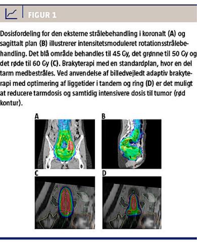 Den eksterne strålebehandling blev givet med VMAT, der giver mulighed for at behandle relativt store volumina og samtidig reducere dosis til raske organer. VMAT har yderligere den fordel, at dosis til patologiske lymfeknuder kan øges vha. simultanintegreret boost. Dermed reduceres omfanget af akutte bivirkninger og risikoen for sene bivirkninger, der typisk opstår måneder til år efter endt behandling [1]. Hos patienten i sygehistorien blev lokalkontrol af cervix sikret ved hjælp af MR-skanningsvejledt adaptiv brakyterapi, der i monoinstitutionelle studier har vist sig at være traditionel røntgenvejledt brakyterapi overlegen mht. både overlevelse (5-10% forbedring) og morbiditet hos patienter med cervixcancer [2, 3].