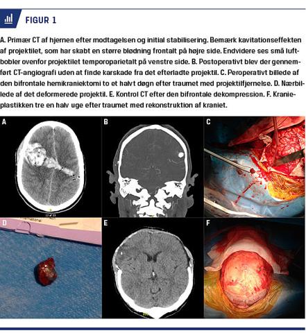 En 31-årig rask mand blev i embeds medfør ramt i højre lår og efterfølgende i højre frontalregion af hovedet med et lavkaliberprojektil affyret på klos hold. Ved ankomsten til hospitalet havde han egen respiration, åbne øjne og fleksionsmønster i ekstremiteterne, men ytrede intet (Glasgow Coma Scale (GCS) 9). Han blev intuberet og udredt med traume-CT (Figur 1). Der blev foretaget akut udrømning af det intracerebrale hæmatom i højre hemisfære og anlæggelse af et eksternt ventrikeldræn med trykkateter. En postoperativ kontrol-CT-