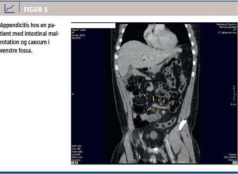 Situs inversus findes hos 0,02-0,04% og intestinal malrotation hos 0,03-0,5% af befolkningen. Appendicitis acuta i venstre side af abdomen er en sjælden tilstand, som i større opgørelser over akut appendicitis forekommer i 0,09% af tilfældene pga. malrotation og i 0,01% pga. situs inversus [2]. I en nyligt publiceret oversigt over de 95 publicerede engelsksprogede tilfælde af venstresidig appendicitis siden 1893 spændte patienternes alder fra 8 år til 82 år med en medianalder på 29 år, 66 patienter havde situs inversus, og 23 patienter havde malrotation. Af de 95 tilfælde havde 59 patienter smerter i venstre fossa, og 14 havde højresidige smerter, mens syv havde smerter i begge sider, som patienten i sygehistorien. Diagnosen var stillet præoperativt hos 49 patienter, og kun 14 patienter vidste, at de havde en malformation. Det er ikke opgjort, i hvor mange tilfælde der var perforation på grund af mulig forsinkelse [3]. Tilstanden er beskrevet to gange i Danmark, senest i 1987 [4]. Siden da har udviklingen af CT og ultralydskanning af abdomen givet mulighed for en bedre præoperativ diagnostik [5]. Ultralydskanning af abdomen med anvendelsen af farve-Doppler giver en positiv prædiktiv værdi for appendicitis på 91-94%, såfremt en række velbeskrevne kriterier er opfyldt, mens CT af abdomen i tillæg til diagnosen appendicits også giver information om årsagen til en venstresidig placering [5]. Symptomerne på akut appendicitis i venstre fossa varierer og kan blandt andet forveksles med divertikulitis eller salpingitis hos yngre kvinder [2].