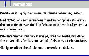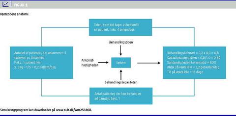 Summary Waiting time for treatment shall be calculated correctly Ugeskr Læger 2011;173(21):1486-1489 Every system is perfectly designed to achieve the results it gets and in the Danish health care system there is a significant waiting time for the patients. If we want this result to change, we have to change something in the system, but before we do that, we need to understand the system. With queuing theory as a frame of reference, the anatomy and physiology of waiting time is illuminated in order to bring additional knowledge into the design of systems in health care.