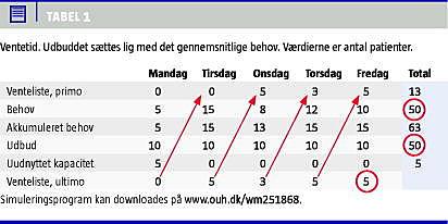 Her følger et eksempel: Hvis antallet af patienter, der visiteres til forundersøgelse, varierer mellem 5 og 15 pr. dag, er det gennemsnitlige behov på 10 forundersøgelser pr. dag. Sættes udbuddet af forundersøgelser lig med det gennemsnitlige behov på 10, kan der imidlertid opstå en markant venteliste på blot én uge (Tabel 1 ).