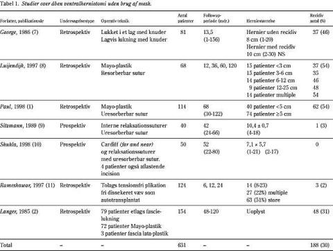 Behandling af ventralhernier med simpel adaptation af fasciekanterne har recidivrater på op mod 46 % (7) (Tabel 1 ). Mayo-plastik er en primær suturering uden aflastende incisioner eller aflastende suturer, hvorfor der kun på små hernier opnås tensionsfri plastik. Ved anvendelse af Mayo-plastik udvikles der recidiv hos 54 % efter en followupperiode på 68-120 mdr. (1, 8) (Tabel 1).