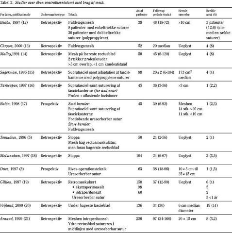 To små prospektive studier, med 7-10 cm store hernier viste ved simpel lukning af bugvægsdefekten sammen med relaksationssuturer og eventuelt aflastende insicioner recidivrater på 0-2,5 % efter en followupperiode på 42-52 mdr. (Tabel 1) (9, 10). Ved større defekter har enkelte forfattere beskrevet autologe implantater herunder interponering af hudgraft, interponering af fasciegrafter, anvendelse af broksækken som lukkemateriale og anvendelse af fri dissekeret abdominalt fascievæv. Disse teknikker har en yderst begrænset anvendelse og stiller store krav til den operative teknik. Der findes kun små serier med resultater, der ikke kan reproduceres. Ved anvendelse af autologe implantater findes recidivrater på 2-31 % (2, 11).