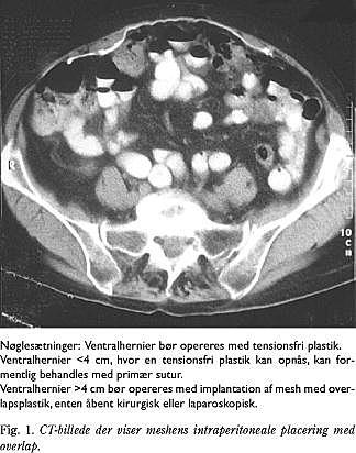 Summary Ventral herniotomy: development of operative technique and effect on the frequency of recurrence. Ugeskr Læger 2003;165: 672-8. The surgical journal, Repair of Ventral Hernias, was reviewed with regard to recurrence of hernia. Ventral hernias must be operated on with a tension-free technique. It is recommended that hernias larger than 4 cm are repaired with mesh. A randomised, controlled trial has yet to be carried out to determine whether even small hernias should be repaired with mesh. Controlled and uncontrolled studies have shown that the use of mesh to repair larger hernias results in a lower recurrence rate. The operative technique with the mesh placed to bridge the wall defect gives a higher rate of recurrence than does an overlap technique. The overlap of the mesh and its placement in relation to the different layers of abdominal wall are not defined. The laparoscopic operation using the overlap technique and intraperitoneal mesh has shown a lower recurrence rate than the open technique. However, a randomised, controlled study comparing the laparoscopic and open overlap technique over a long follow-up period still needs to be conducted.