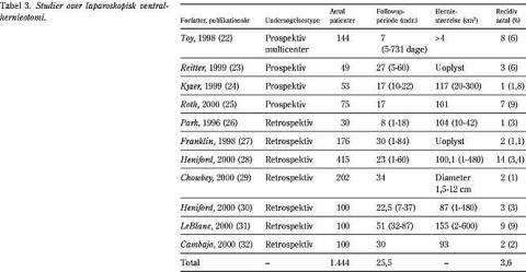 De seneste år har laparoskopisk herniotomi været anvendt med en intraperitoneal overlapsteknik, hvor meshen fæstnes mod peritoneum (Fig. 1 ). Der anvendes fra 3-5 trocharer oftest én på 10 mm og de øvrige på 5 mm. Variationerne ved den laparoskopiske procedure består i fiksering af meshen med henholdsvis coils, stabling eller suturer samt størrelsen af meshens overlap af bugvægsdefekten. I fire prospektive studier konstaterede man recidivrater på 1,8-9 % efter followupperioder på 7-27 mdr. (Tabel 3 ) (22-25). Fundene i de syv retrospektive studier afviger ikke væsentligt fra fundene i de ovenfor beskrevne prospektive studier med recidivraterne på 1-9 % efter 8-51 måneders followup (Tabel 3) (26-32).