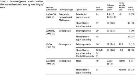 Herniotomi med og uden mesh sammenlignedes i et prospektivt randomiseret studie med i alt 181 patienter med hernier < 6 cm. Der var signifikant færre recidiver ved anvendelse af mesh efter tre år (Tabel 4 ) (4). De øvrige studier, hvor man sammenlignede åben operation med og uden brug af mesh, er alle retrospektive. I alle tre studier var recidivraten lavest ved implantation af mesh, henholdsvis 8-29 % recidiv mod 25-59 % ved simpel suturteknik. Konklusionen var, at anvendelse af mesh nedsatte recidivraten (34-36).