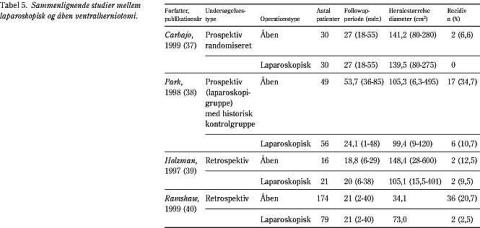 I studierne med laparoskopisk intraperitoneal overlapsteknik indgik i alt 1.444 patienter, med en gennemsnitlig recidivrate på 3,6 % (Tabel 3). I et prospektivt randomiseret studie mellem laparoskopisk og åben teknik fandt man ingen recidiver i laparoskopigruppen, mod 6,6 % i gruppen med åben operation (37). I et prospektivt studie med en historisk kontrolgruppe fandt man færrest recidiver ved laparoskopisk teknik, 10,7 % mod 34,7 % i åben herniotomi-gruppen (38). I to retrospektive sammenlignende studier var der ligeledes færrest recidiver i laparoskopigruppen (39, 40) (Tabel 5 ). Således fandt man i alle fire sammenlignende studier lavere recidivrate ved laparoskopisk ventralherniotomi end ved åben operativ teknik.