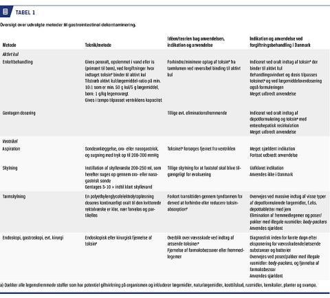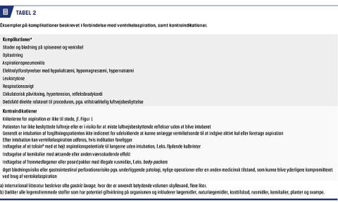 I forbindelse med de mange tusind henvendelser, som Giftlinjen årligt modtager direkte fra sundhedsfaglige, primært læger, observeres der hyppig anvendelse af ventrikelaspiration ved forgiftninger [2]. I denne artikel præsenteres den relevante viden på området, herunder internationale anbefalinger. Formålet er at placere anvendelsen af ventrikelaspiration korrekt i forhold til andre gastrointestinale dekontamineringsmetoder tilpasset det danske sundhedsvæsen. Yderligere præsenteres vigtige fysiske og praktiske forhold ved en række giftstoffer, der har betydning ved en eventuel ventrikelaspiration. Ligeledes omtales anvendelsen af aktivt kul, da dette ofte har dannet sammenligningsgrundlaget for studier, hvor effekten af ventrikeltømning er undersøgt, men evidensen for anvendelsen af aktivt kul i forgiftningsbehandlingen gennemgås ikke her (Tabel 1).