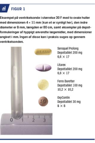 En teoretisk forudsætning for at udføre en effektiv ventrikelaspiration er dels, at det mistænkte toksiske stof er til stede i ventriklen, og at stoffet fysisk kan passere gennem hullerne i sonden. For faste formulerede lægemidler gælder det således, at tabletten/kapslen skal være lille eller henfaldet og opløst i betydende grad [16]. En stor del af de lægemidler, der er formuleret som depotpræparater, og mange almindelige formuleringer vil rent fysisk ikke kunne hentes op (Figur 1). Dannelsen af et farmacobezoar (sammenklistret kapsel-/tabletmasse) vil ligeledes forhindre ophentning [25-28]. Omvendt forventes det, at flydende toksiner, herunder lægemiddelmiksturer og kemikalier, som udgangspunkt hurtigt tømmes af ventriklen (forventeligt inden for en time). Der er dermed næppe en klinisk betydende effekt af ventrikelaspiration, hvis den foretages ud over en time efter toksinindtag.