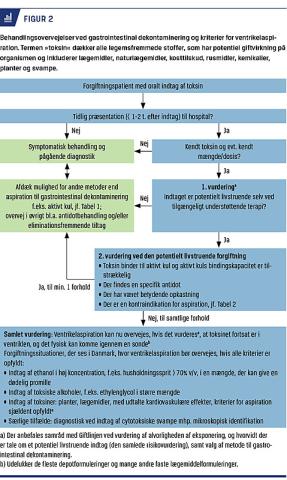 Ventrikeltømning ved forgiftninger har været anvendt gennem årtier ud fra ideen om, at giftstoffet kunne evakueres fra mavesækken og derved ikke udøve giftvirkning på kroppen. Interventionen er præget af tradition. Der er minimal litteratur, hvor effekten af aspiration belyses, uden at man samtidig har foretaget gentagne skylninger af ventriklen. Litteraturen om ventrikelaspiration kombineret med ventrikelskylninger viser heller ingen gavnlig effekt. Komplikationer ved sondeanlæggelsen kan til gengæld være af betydning. Rutinemæssig ventrikelaspiration frarådes internationalt, og en opdateret litteraturgennemgang giver ikke anledning til at anbefale aspiration. Vi anbefaler, at rutinemæssig ventrikelaspiration undlades, og anden indiceret behandling f.eks. indgift af aktivt kul og understøttende behandlinger prioriteres (Figur 2). I undtagelsestilfælde, hvor den forgiftede patient ankommer tidligt til hospitalet med en potentielt livstruende forgiftning, og der ikke findes gode alternative behandlingsmuligheder, kan ventrikelaspiration overvejes. Dette forudsætter dog fravær af kontraindikationer, og at der er tale om et giftstof, der fysisk kan komme igennem en sonde. I alle tilfælde bør interventionen først ske efter samråd med Giftlinjen.