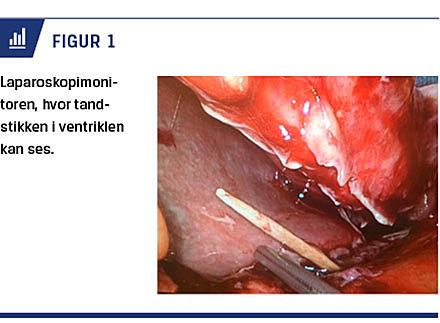 Paraklinisk fandtes en temperatur på 39,3 °C og en puls på 96 mmHg. Blodtryk, saturation og respirationsfrekvens var alle inden for normalområdet. Biokemiske analyser viste følgende værdier: C-reaktivt protein: 100 (normalværdi < 8) mg/l, let leukocytose på 15 (normalværdi 3,5-10,0) mia./l samt hæmoglobin på 8 (normalværdi 8,3-10,5) mmol/l. Øvrige biokemiske værdier var normale. Ved klinisk undersøgelse fandtes dagen efter indlæggelsen peritoneal reaktion, og der blev bestilt en CT-oversigt over abdomen på mistanke om perforeret hulorgan. CT’en viste fri luft under leveren og omkring duodenums første og andet stykke, som også var vægfortykket, samt reaktion i det omkringliggende fedtvæv. På mistanke om perforeret ulcus blev der foretaget diagnostisk laparoskopi. Her fandt man i ventriklens antrum en perforation, som var forårsaget af en tandstik af træ (Figur 1). Tandstikken blev fjernet og man oversyede ventrikelperforationen fortløbende med V-loc-sutur. Patienten fik peroperativt antibiotisk behandling. Det postoperative forløb var ukompliceret, og han blev udskrevet på tredje postoperative dag.