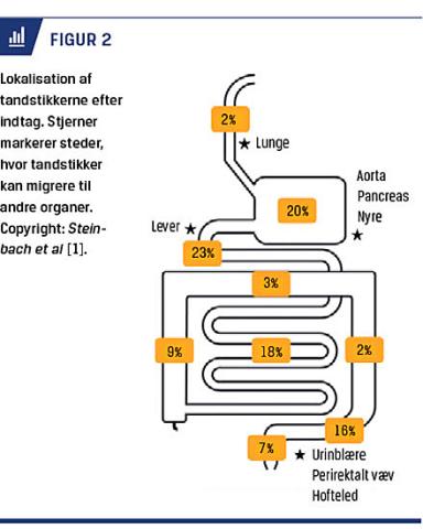 kasuistikker siden 1980, og tilstanden er alvorlig med en mortalitet på 9,6% [1]. Herudover er bl.a. fiskeben samt andre knoglerester beskrevet som årsag til perforation [2]. Figur 2 viser de hyppigste lokalisationer for perforation [1]. I 2014 foreslog Steinbach et al på baggrund af 136 rapporterede tilfælde en oversigt over klinisk præsentation samt en guideline til håndtering af GI-skade forårsaget af tandstikker. Patienterne havde hyppigst akut opståede mavesmerter (83%), feber (39%) og kvalme (31%) [1]. Ca. 46% kunne huske at have slugt en tandstik [1]. 80% af tandstikkerne perforerede GI-kanalen, hvorfor spontan passage ikke skal forventes [3]. Med CT identificeredes tandstikken og dens beliggenhed med en sensitivitet på 43% [1]. Tidlig endoskopi med fjernelse af tandstikken anbefales som førstevalg, hvilket bl.a. bygger på en mortalitet