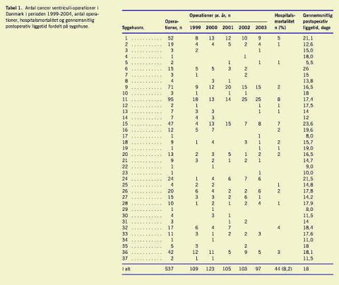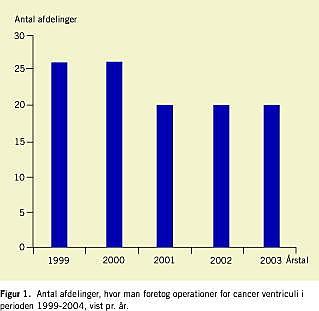 Resultater: Der blev i perioden udført 537 ventrikelresektioner for cancer på 37 afdelinger fordelt på ca. 20 afdelinger årlig. På fem afdelinger blev der udført 57% (307 ud af 537) af operationerne, mens man på 20 afdelinger udførte 10% (55 ud af 537). Den gennemsnitlige postoperative indlæggelsestid (primær- og genindlæggelse) var på 18 dage. Hospitalsmortaliteten var på 8,2%, ligeligt fordelt mellem Billroth II- og gastrektomi a.m. Roux-operationer. De små tal muliggør ikke statistisk vurdering af resultaterne imellem afdelingerne.