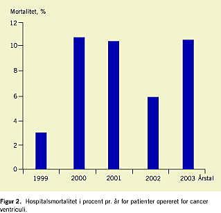 I udenlandske arbejder er der vist en klar sammenhæng mellem mortalitet og hospitals- og kirurgvolumen efter større cancerkirurgi som f.eks. øsofagektomi og pancreasresektion [3, 4]. Således fandt man i en amerikansk undersøgelse af i alt 2,5 mio. operationer, heraf ca. 35.000 gastrektomier, i perioden 1994-1999, en klar sammenhæng mellem antal operationer pr. år og mortalitet, faldende fra 13% på hospitaler med < 5 operationer årlig til 8,7% ved > 21 operationer årlig [3]. I en tilsvarende undersøgelse fra staten New York blev der fundet en mortalitet på 11,2% på lavvolumenhospitaler (laveste kvartil) i modsætning til 2,9% på højvolumenhospitaler (højeste kvartil) [5]. I undersøgelsen fandt man også en signifikant (ca. 5%) forskel i mortaliteten mellem høj- og lavvolumenkirurger [5].