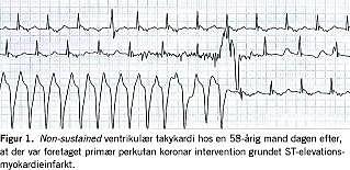 Der blev foretaget en retrospektiv opgørelse af patienter, der var indlagt på Kardiologisk Afdeling B, Rigshospitalet, med hoved- eller bidiagnoserne I47.2 ventrikulær takykardi, I49.0 ventrikelflimren/ventrikelflagren og I49.3 ventrikulær ekstrasystoli. Der blev ikke inddelt efter non sustained (Figur 1 ), sustained (Figur 2 ) eller monomorf/polymorf arytmi. Patienter, der var kodet som »institio cordis med vellykket genoplivning« indgik ikke i opgørelsen. Patienter, der blev indlagt i perioden fra den 1. januar 1998 til den 1. juni 2004 (i alt seks år og fem måneder) blev inkluderet i opgørelsen. Patienternes data blev systematisk gennemgået, og følgende blev registreret: 1) patientens alder ved første indlæggelse for den givne diagnose i den undersøgte periode, 2) køn, 3) diagnose (VT, VF, VES) i henhold til International Classification of Diseases-10. Hvis flere af de undersøgte diagnoser var anvendt hos samme patient, blev tilfældet drøftet i forfattergruppen, og konsensus blev opnået, 4) den formodede, primære ætiologi til patientens arytmi (Tabel 1 ), 5) evt. indopereret ICD-enhed og 6) evt. forudgående klinisk hjertestop - og i givet fald om der var tale om underliggende potentiel reversibel årsag, f.eks. akut myokardieinfarkt.