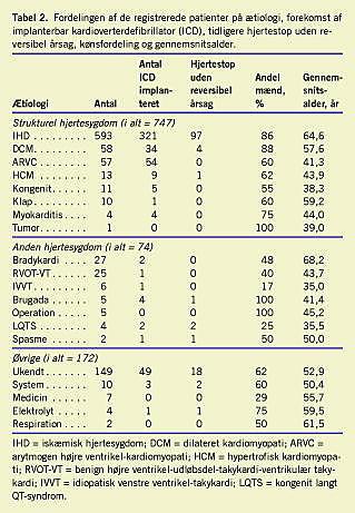 Resultater: Populationen havde en gennemsnitsalder på 59 år (spændvidde: 15-95 år), og hovedparten var mænd (76%). Blandt patienterne med kendt ætiologiske faktor var iskæmisk hjertesygdom (60%), dilateret kardiomyopati (6%) og arytmogen højre ventrikel-kardiomyopati (6%) de hyppigste. En større del (15%) havde ukendt ætiologi. I alt 492 (50%) patienter fik en ICD-enhed og majoriteten af disse patienter blev udskrevet med diagnosekoden ventrikulær takykardi (92%). Et hundrede og otteogtres patienter havde haft hjertestop. Heraf var 127 uden potentiel reversibel årsag. Af denne sidstnævnte gruppe fik 75 (59%) en ICD-enhed.