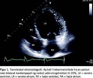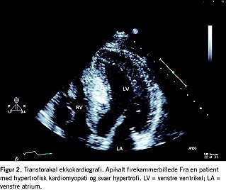 Der skelnes mellem følgende kardiomyopatier [1]: dilateret kardiomyopati (DCM): hjertemuskelsygdom karakteriseret ved dilatation og pumpefunktionsnedsættelse af venstre ventrikel eller begge ventrikler (Figur 1 ). DCM kan være slutstadiet af forskellige årsager til myokardieskade på basis af inflammatoriske, toksiske, metaboliske og infiltrative tilstande. Tilstanden er hyppigst idiopatisk, men kan forekomme familiært. Den nedsatte venstre ventrikel-funktion resulterer typisk i funktionsdyspnø. Prævalensen i Danmark er 1: 2.500 [2]. Hypertrofisk kardiomyopati (HCM): hjertemuskelsygdom karakteriseret ved øget vægfortykkelse af venstre og/eller højre ventrikel (Figur 2 ). En væsentlig følge af hypertrofien er nedsat diastolisk funktion. Hos symptomatiske patienter er brystsmerter og funktionsdyspnø næsten altid til stede. HCM kan manifestere sig klinisk som ventrikulære takyarytmier muligvis på grund af en abnorm orientering af ventriklernes myofibriller og interstitiel fibrose eller som hjertesvigt på grund af nedsat diastolisk funktion. Der ses familiær forekomst, og der er fundet flere genmutationer, der er associeret med HCM. Prævalensen i Danmark er 1:500. Arytmogen højre ventrikel-kardiomyopati (ARVC): hjertemuskelsygdom, der er karakteriseret ved fedtinfiltration og fibrose i myokardiet og primært inddrager højre ventrikel. ARVC forekommer bl.a. familiært og manifesterer sig klinisk med ventrikulære arytmier, der udgår fra højre ventrikel og således typisk har venstresidig grenblokskonfiguration. Kardinalsymptomet er palpitationer, (nær)synkoper og pludselig død. Der er fundet flere genmutationer, der er associeret med sygdommen. Prævalensen i Danmark er 1:5.000.
