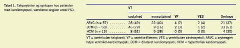 Blandt patienterne med DCM havde 55 VT (heraf 84% sustained ), to havde VF, og en havde VES. I 61% af tilfældene havde patienten været synkoperet. Hos patienterne med ARVC havde 51 VT (55% sustained ), fire havde VF, og to havde VES, 37% havde haft synkope. Alle patienter med HCM havde VT (62% sustained ), og 30% havde haft synkope (Tabel 1 ).