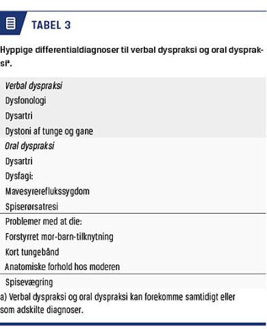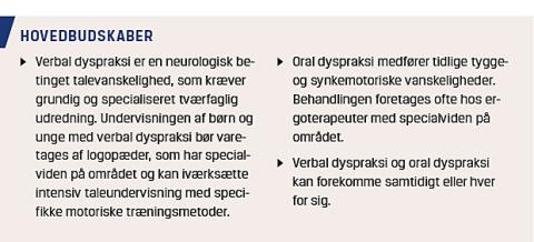 Verbal dyspraksi (VD) og oral dyspraksi (OD) er undertyper af lidelsen dyspraksi [1], en neurologisk betinget forstyrrelse, der giver besvær med organisering, planlægning og udførelse af viljestyrede bevægelser, uden at der er egentlige neurologiske udfald såsom lammelser. Ofte ses en kombination af planlægningsbesvær (ideationel dyspraksi) og handlingsbesvær med langsomme, ikkeflydende bevægelser (ideomotorisk dyspraksi) [2]. Dyspraksi kan afficere motorikken i afgrænsede muskelgrupper: VD kompromitterer tale [3], mens OD rammer de ikketalerelaterede orofaciale bevægelser, f.eks. suge-, sutte-, tygge- og synkefunktionen [4]. Børn med VD og/eller OD vil som regel behøve langt mere struktureret, intensiv motorisk træning end børn med andre, mere hyppigt forekommende, vanskeligheder for at opnå et normalt funktionsniveau. Indimellem påvises der samtidige sensoriske problemstillinger, men hvorvidt der er tale om varianter af dyspraksi eller komorbiditet, er endnu ikke tilstrækkeligt beskrevet.