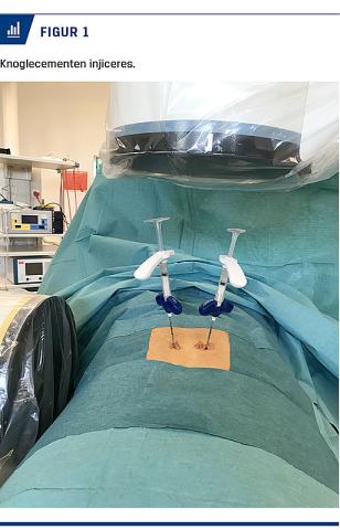 Det kan være en udfordring at smertelindre patienterne sufficient, så de kan opretholde deres aktivitetsniveau og livskvalitet. En behandlingsmetode til palliering af smerter fra rygsammenfald er perkutan vertebroplastik (PVP). Her injiceres der knoglecement perkutant og transpedikulært i en vertebra, som har mistet sin strukturelle stabilitet (Figur 1). Metoden blev udviklet sidst i 1980’erne i Frankrig til behandling af vertebrale hæmangiomer og osteolytiske vertebrale tumorer [1]. Indikationerne blev siden udvidet til også at omfatte kompressionsfrakturer forårsaget af osteoporose.
