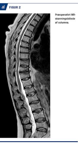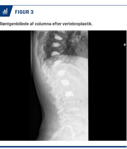 Man bør være opmærksom på kompressionsfrakturer ved spontant opståede rygsmerter eller ved rygsmerter, der er opstået ved beskedne traumer. Diagnosen bekræftes med konventionel røntgenoptagelse af columna i to plan. Hvis man påtænker at tilbyde patienten PVP, er der behov for en MR-skanning (Figur 2). Hos patienter med osteoporose indikerer aktivitet på en MR-skanning med STIR-frekvens et friskt sammenfald/manglende heling af frakturen [15]. Dette har betydning for, om man kan tilbyde PVP, da behandlingen ikke har vist effekt på sammenfald uden aktivitet [15]. Ved mistanke om maligne læsioner kan man ofte bekræfte diagnosen og visualisere en læsion af hvirvlens bagkant ved skanning. En sådan læsion er en relativ kontraindikation for PVP pga. risiko for cementlækage ind i spinalkanalen [16]. Ved sammenfald, der er opstået pga. myelomatose, ses der ikke altid aktivitet på en MR-skanning [17]. Tilbud om PVP til patienter med myelomatose afhænger af den kliniske vurdering [18].