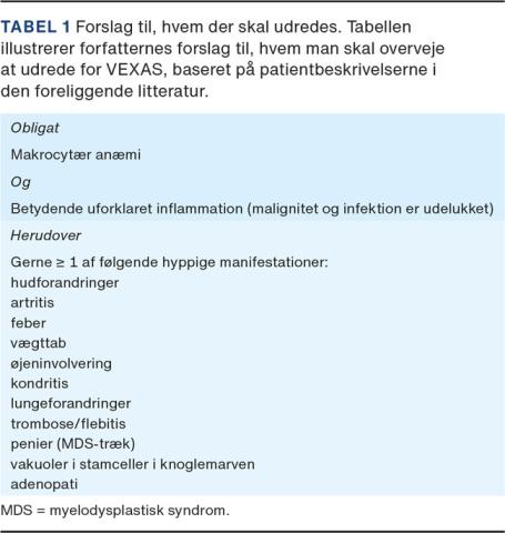 Der findes endnu ikke international konsensus om, hvilke fund der bør foranledige udredning for VEXAS. Baseret på den foreliggende litteratur og egne erfaringer med patienter med VEXAS vil vi anbefale udredning for VEXAS hos mandlige patienter, som opfylder kriterierne anført i Tabel 1. Udredningen bør varetages i relevant regi.