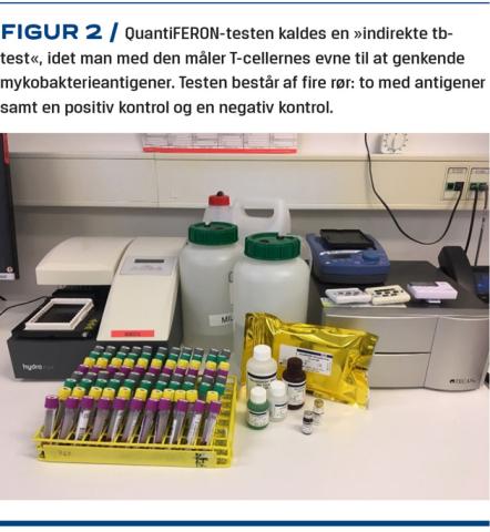 Der er to test i brug i Danmark: Mantoux og QuantiFERON (QFT), som er et IGRA. Man kan ikke differentiere mellem LTBI og aktiv tb-sygdom med nogen af disse test. Testene kaldes for »indirekte tb-test«, idet de måler T-cellernes evne til at genkende mykobakterieantigener. Hverken Mantoux eller QFT er ideelle diagnostiske test for LTBI, da den ideelle test kun bør blive positiv hos dem, der er inficeret med M. tuberculosis og udvikler sygdom. Mantoux er mange steder blevet erstattet af QFT, som har de fordele, at det kun er nødvendigt med én patientkontakt (hvis testen er negativ), og at antigenerne ikke findes i bacille Calmette-Guérin (BCG)-vaccinestammen, hvorfor QFT ikke bliver »falsk positiv« hos BCG-vaccinerede. I QFT er antigenerne specifikke for M. tuberculosis med sjældne undtagelser (M. kansassi, M. marinum og M. szulgai) [12]. QFT består af fire rør, hvoraf to er coatede med M. tuberculosis-antigener, et er en positiv kontrol (mitogencoated), som ved for lav værdi kan indikere, at personen ikke kan producere nok IFN-gamma, og det sidste er en negativ kontrol (nil, uden coating), som skal justere for »baggrunds-IFN-gamma« (Figur 1 og Figur 2).